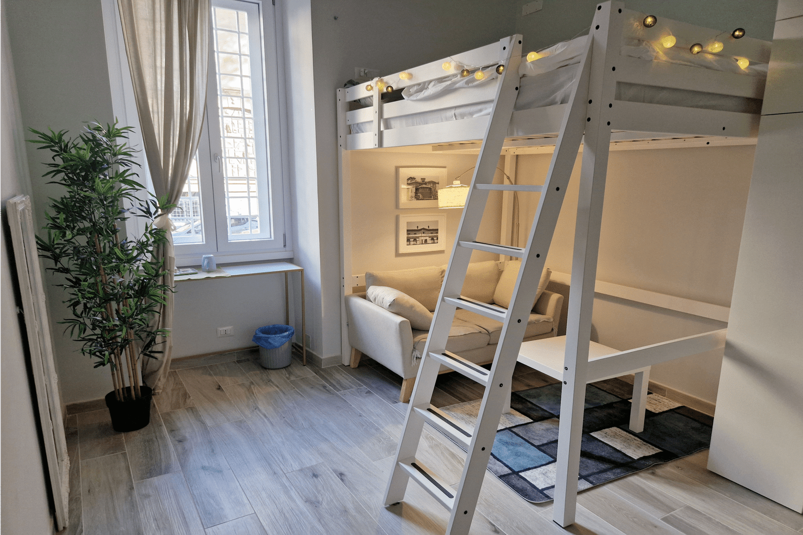 Camera graziosa con letto matrimoniale alla francese a soppalco e area relax/studio sotto. È dotata di bagno privato esterno a pochi passi. Perfetta per giovani e coppie che cercano praticità e un'atmosfera calda e soft.